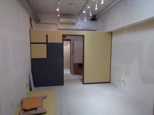 売場とバックヤードを中間壁を作って売場側の壁にハンディーストーンを施工