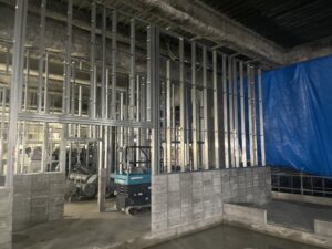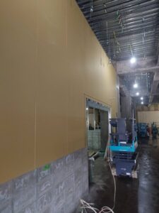 高所作業車を使って軽鉄下地とその上に石膏ボードを性能別に施工して行きます。